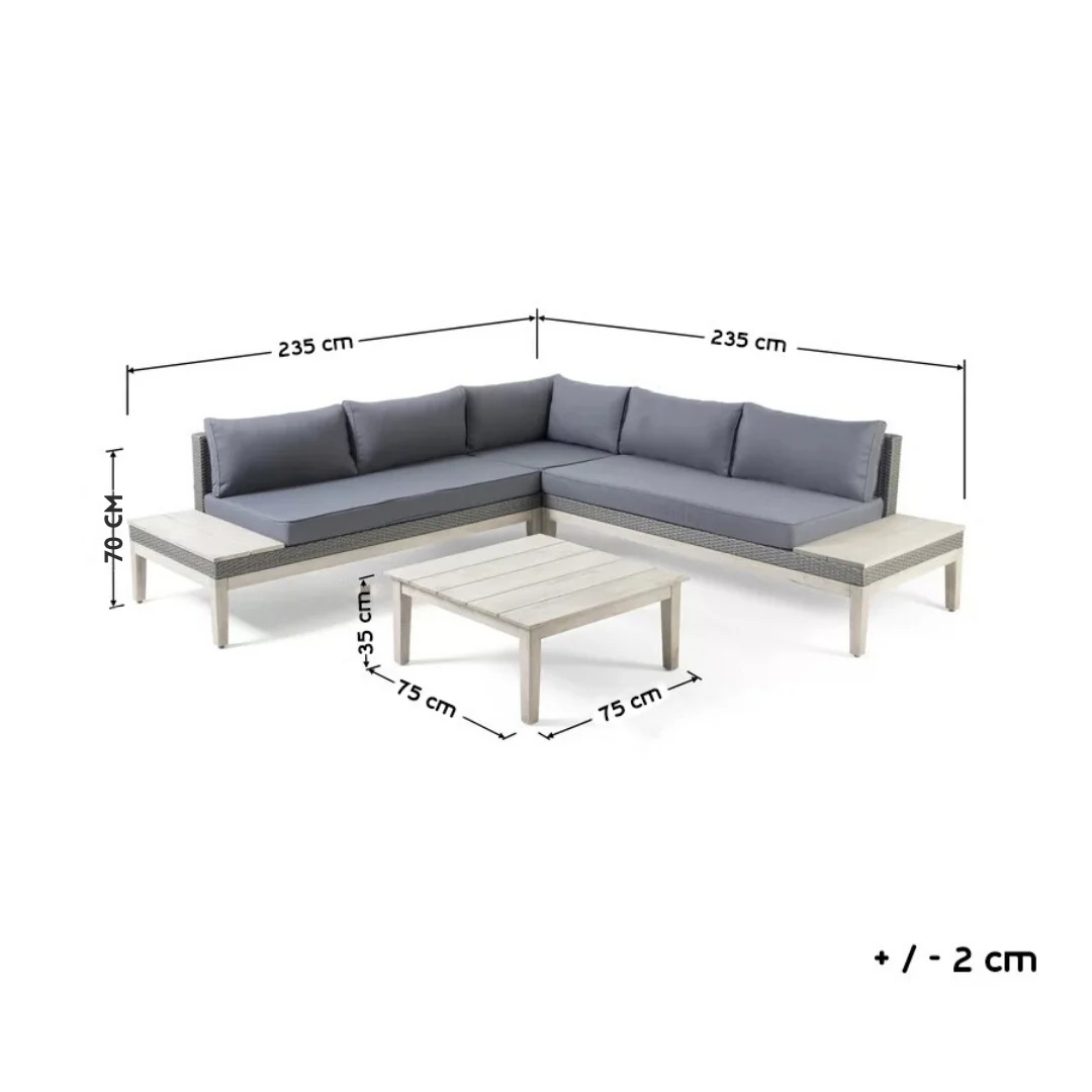 تتكون الركنة من 2 كنبة بمقعدين، كرسي زاوية، وترابيزة، وجميع المكونات يمكن دمجها أو استخدامها بشكل منفصل لتناسب احتياجاتك ومساحة المكان. القماش الووتر بروف المستورد يضيف لمسة من الراحة والعملية، لتصبح هذه الركنة الخيار الأمثل لجلساتك الخارجية الأنيقة والمريحة.