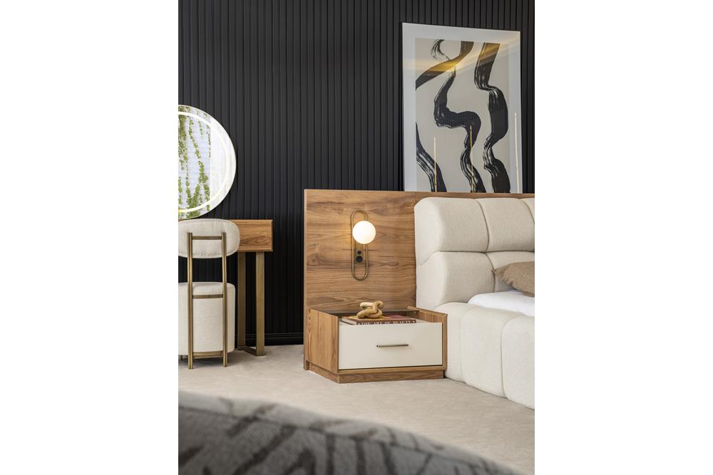 غرفة نوم مصنعة من الأخشاب الطبيعية الكونتر والميلامين باللون الخشبي المقاوم للخدش وسهل التنظيف وصديق للبيئة .